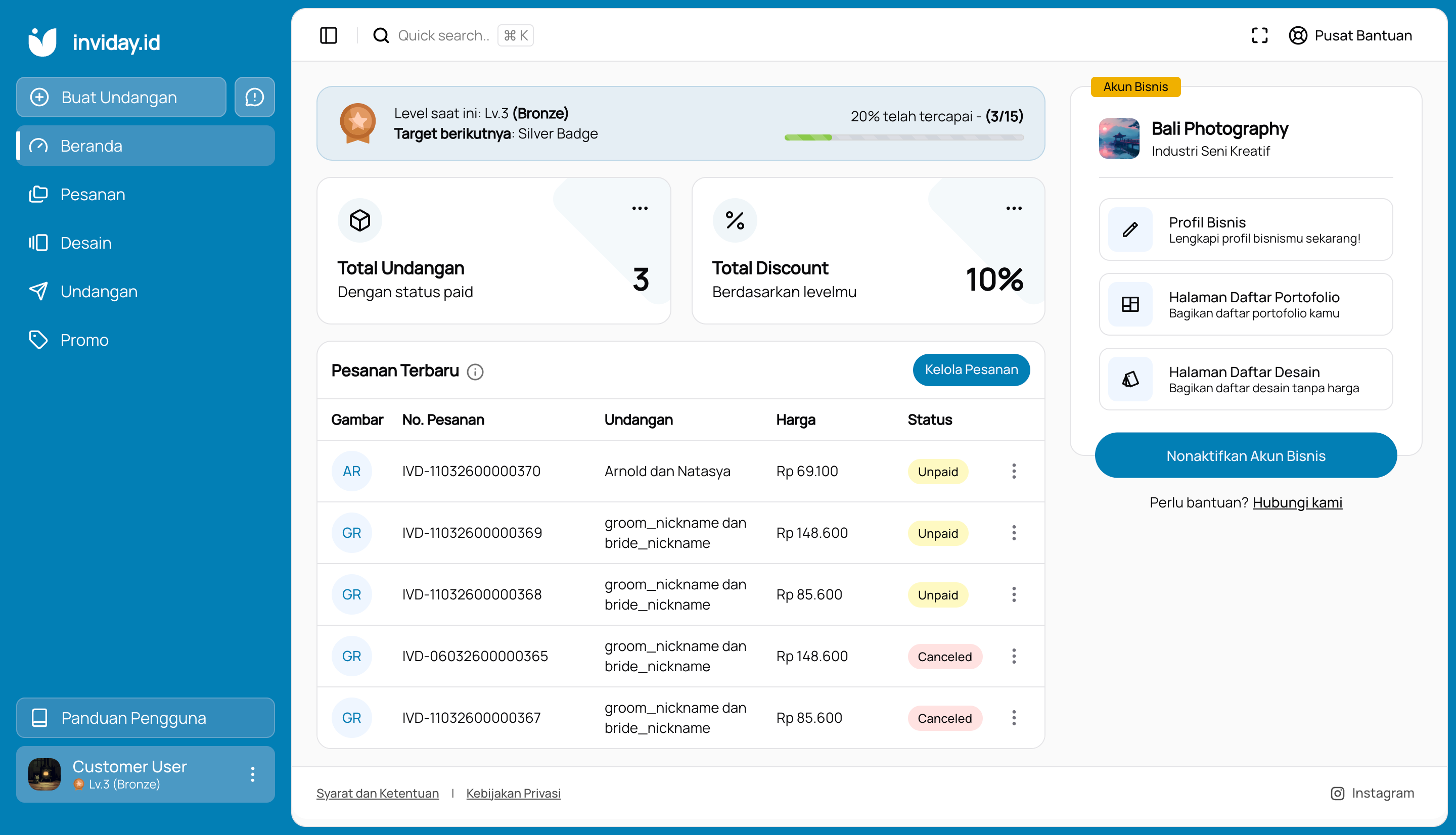 Tingkatkan levelmu untuk mendapatkan diskon undangan yang lebih besar dan mendapatkan beberapa keuntungan lainnya. Terdapat 4 badge yang bisa kamu raih dalam menjual undangan digital di platform ini.